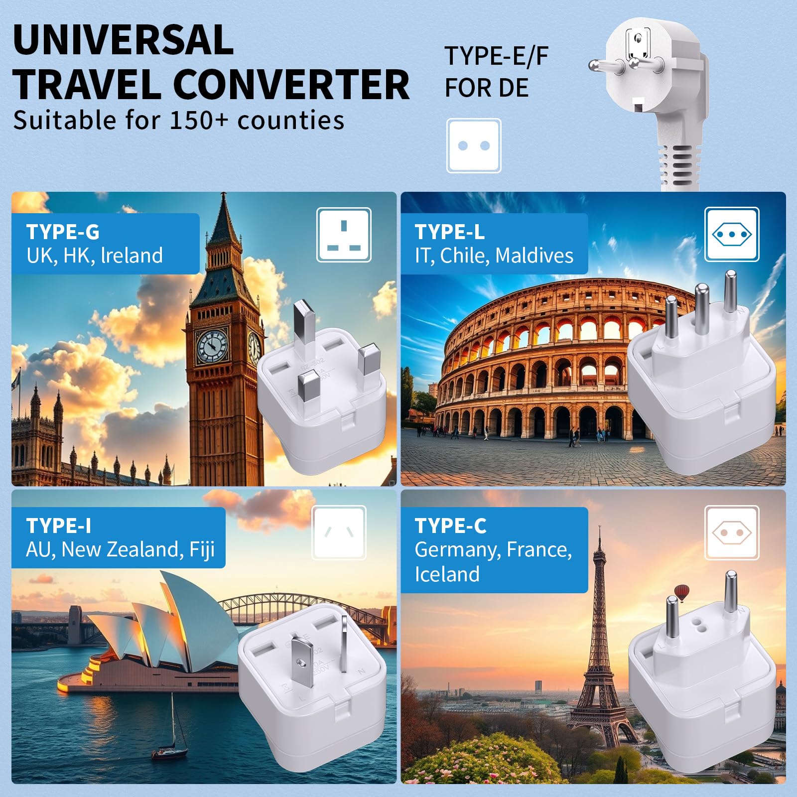 • Global Compatibility for 150+ Countries – Equipped with Type C/G/I/L plugs for universal use. Type C: France, Germany, Italy, Spain, Portugal. Type G: UK, Ireland, Singapore, Hong Kong, Dubai. Type I: Australia, China, Argentina, New Zealand, Fiji. Type L: Italy, Switzerland, Chile, Uruguay, Maldives