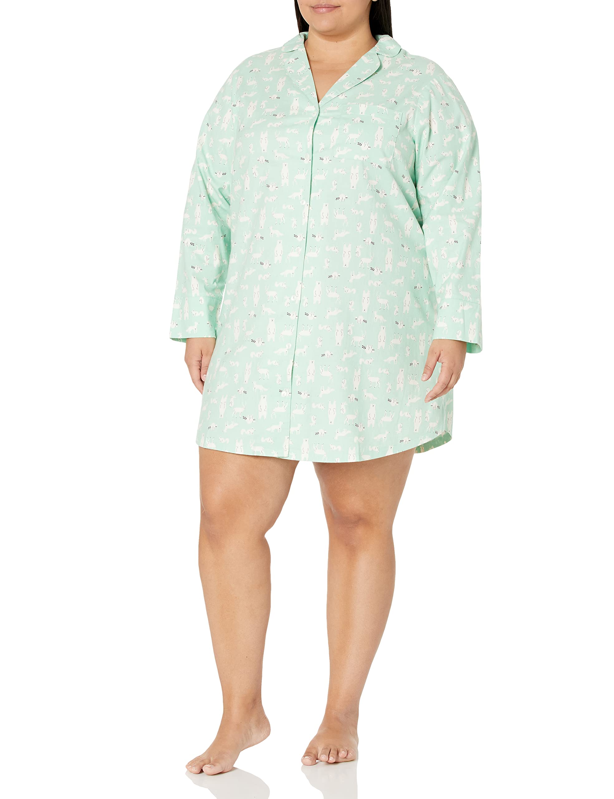 Amazon Essentials Women’s Woven Flannel Notch Collar Nightgown (Available in Plus Size), Mint Green Forest Animals, 1X