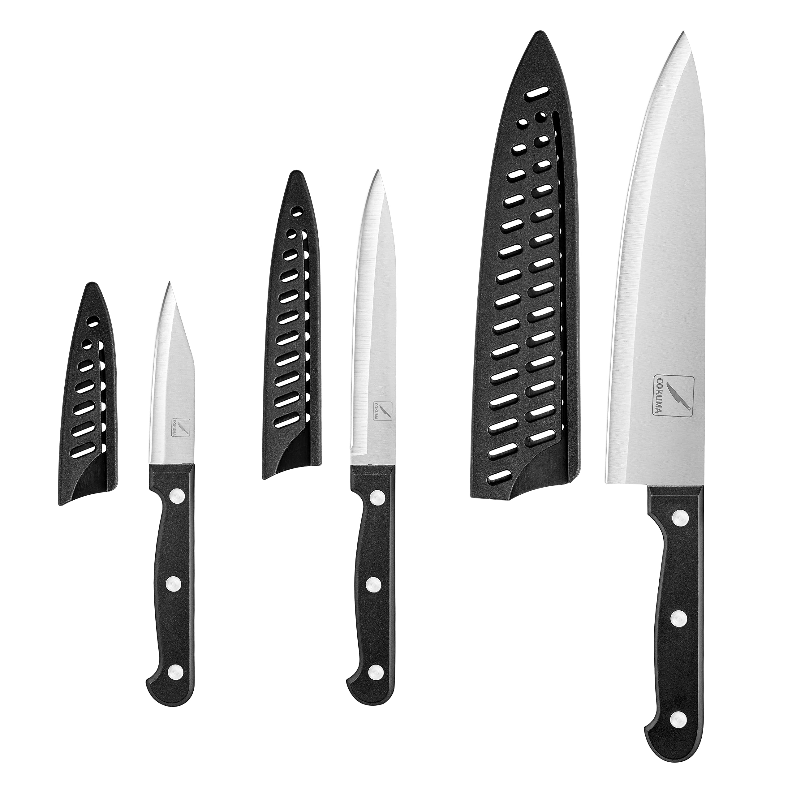 COKUMA Kitchen Knife, 3-Pcs Knife Set With Sheath, 8 Inch Chef Knife, 4.5 Inch Utility Knife, 4 Inch Paring Chef Knife, Stainless Steel, Black