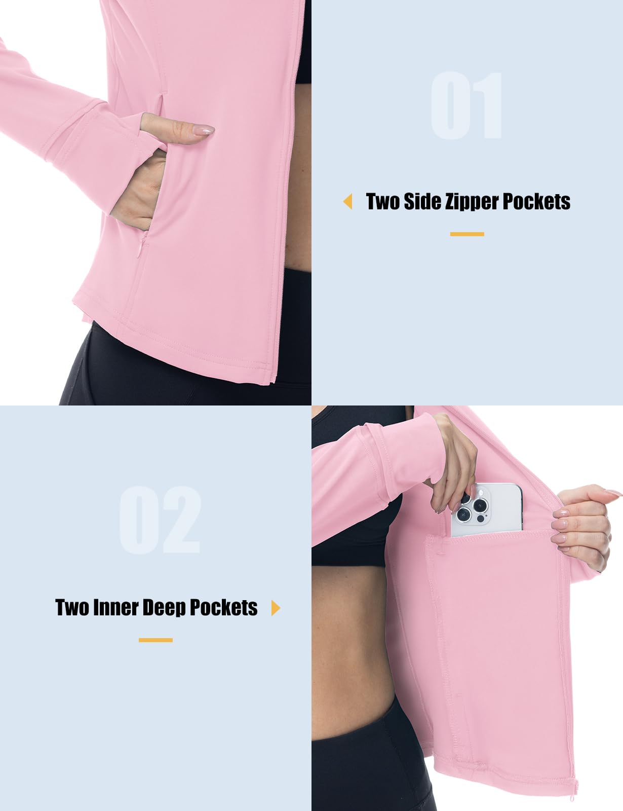 - Full Zip- Zip up jacket easier for taking on or off during exercise