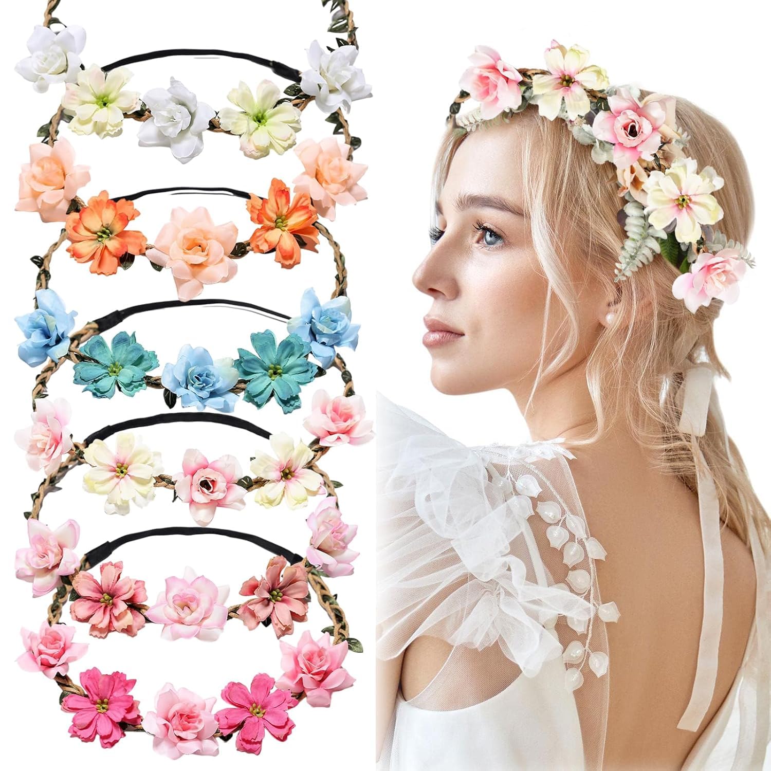 Details: 【Flower Crown Set】:Package comes with 6 pcs/set flower crowns for girls and women. The flower headbands fits for head circumference 52-58 cm/20.5-22.8 inches Colorful Flower Headband: The flower headbands for women are in assorted colors of pink, white, blue, rose, white and mixed. Bright and vivid, chic hair accessorie